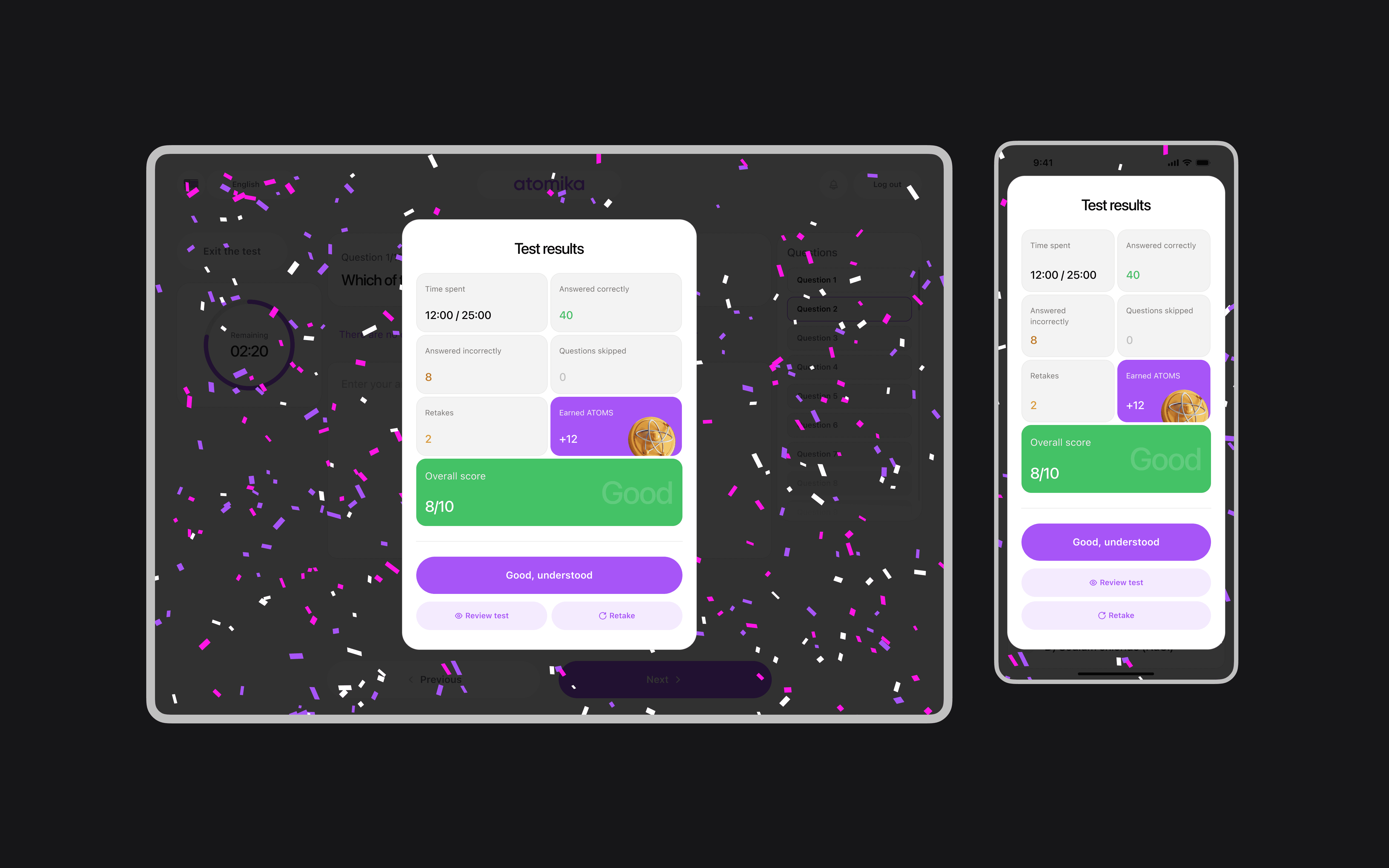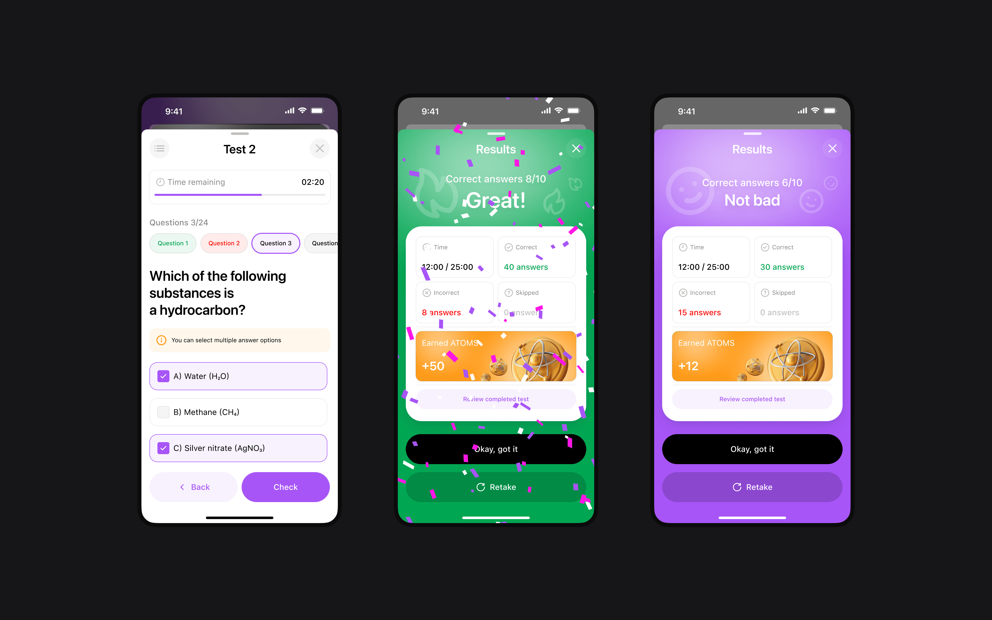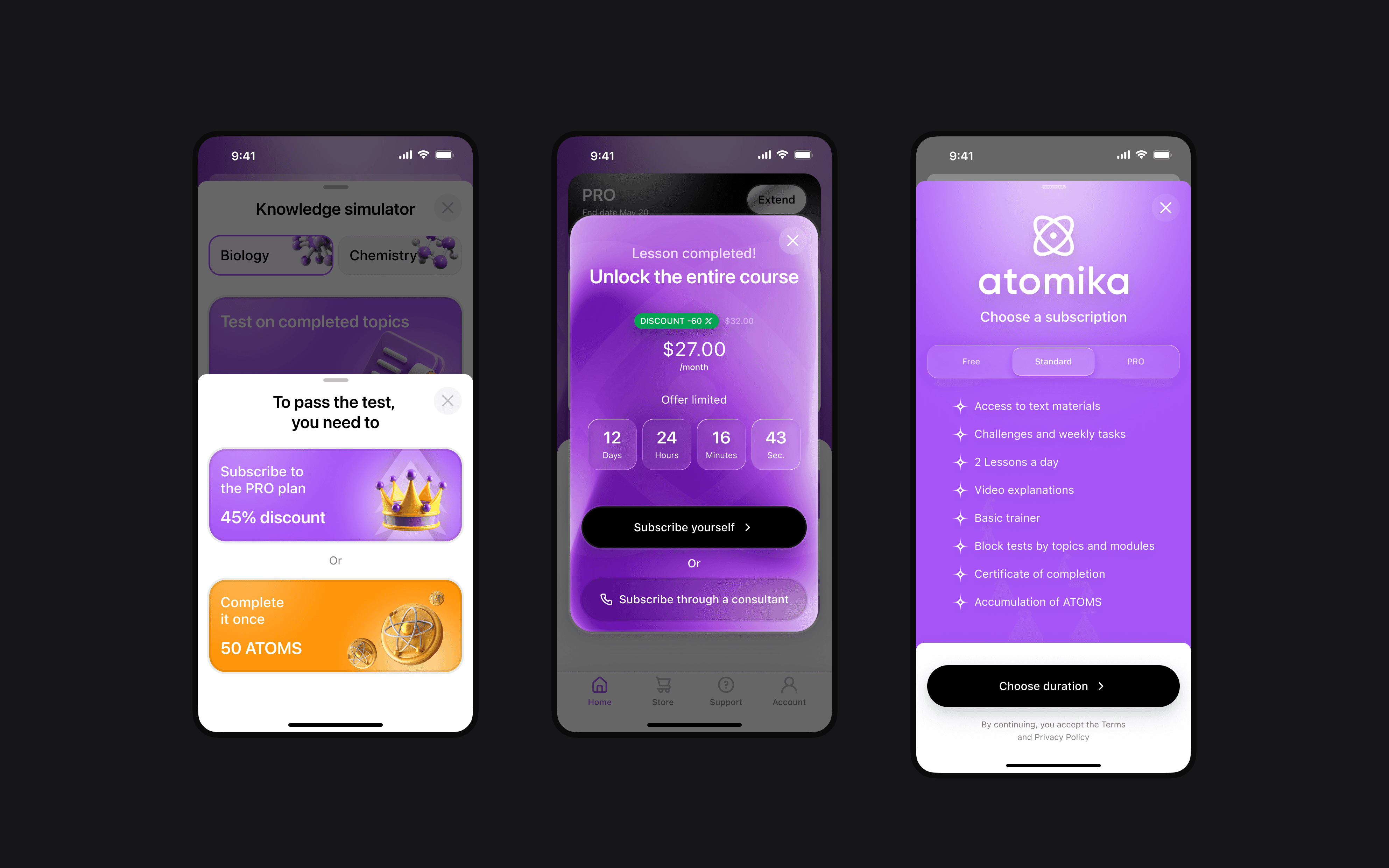 Designed a Telegram-based version of the ATOMIKA platform to make chemistry and biology exam prep more accessible and closer to students’ daily habits. The app introduced Live lessons with real-time notifications and reused proven engagement mechanics from the web platform, driving ~30–40% user adoption and increasing lesson participation by ~25%.